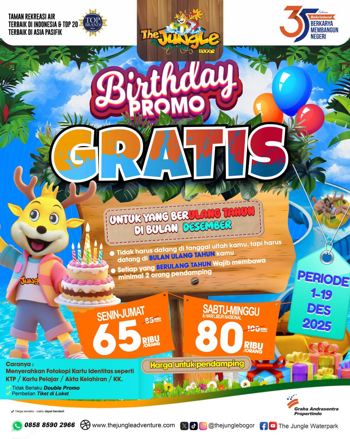 Dalam rangka perayaan hari jadinya, The Jungle Waterpark (salah satu tempat wisata yang ada di Kota Bogor) berikan satu buah tiket liburan Jakarta – Singapura – Jakarta kepada pengunjung.